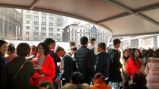 By the early afternoon it was surprisingly warm considering it was still early March. The heat made the air quality deteriorate, a thin mist of particulates formed over the river. With a population of 25 million and a hinterland which is one of China's most productive industrial hubs polution is bound to be a problem. It was clear that the authorities have made some efforts to control it, private cars are less prevalent than in other mega-cities we have visited such as Los Angeles or Tokyo. Also the mopeds scooters and small motorbikes that throng the streets at rush hour have all been converted to electric, most of them ingenious self-builds by the look of it. Good for the environment but hazardous to pedestrians as they are silent and prone to come at you from every angle including on the pavement.